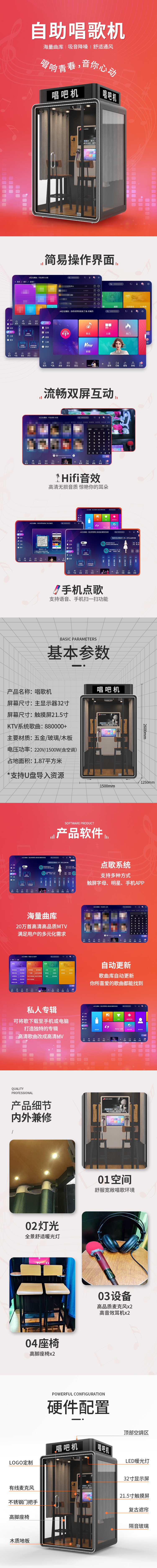 產(chǎn)品特點:這款豪華版唱吧機箱是采用的半掛形式,整體看起來非常美觀大氣,占地面積1.87平方米。KTV系統(tǒng)歌曲88萬+,支持U盤導(dǎo)入歌曲,不定時更新曲目,可手機點歌 支持語音、手機掃一掃功能,HIFI音效 高清無損音質(zhì) 驚艷你的耳朵!
