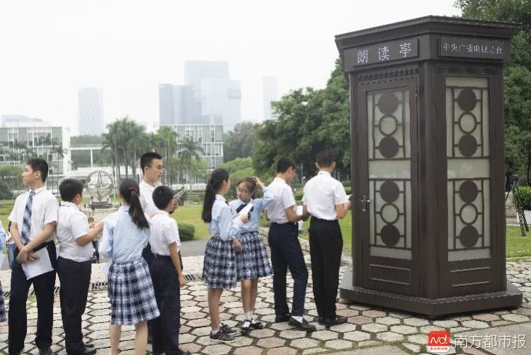 深圳外國語學校的同學來到深圳大學體驗朗讀亭,同學們在朗讀亭門外排隊。